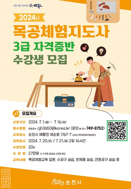 ![]() 순천시, 목공체험지도사 자격증반 수강생 모집 |