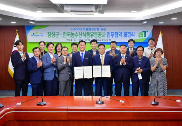 군청 상황실에서 열린 이날 협약식에는 김한종 장성군수, 김춘진 한국농수산식품유통공사 사장, 심민섭 장성군의회 의장, 수출업체 대표 등 다수의 관계자가 참석했다.