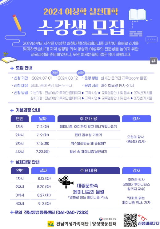 수강 신청은 전남여성가족재단 누리집에서 가능하며, 문의는 전남여성가족재단 양성평등센터로 하면 된다.