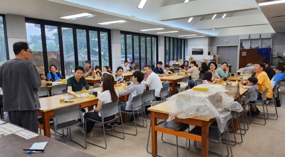 ![]() 제3기 다산가족캠프 가족들이 청자조각 체험을 하고 있다. |