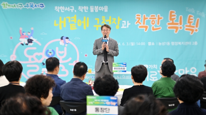 지난 5월 20일 치평동을 시작으로 6월 28일 농성2동까지 6주간 이어진 ‘착한 톡톡’은 김이강 서구청장이 마을 주민들과 현장에서 긴밀하게 소통하며 지역발전을 위한 의견을 수렴하는 민선8기 네 번째 동 순회 소통시리즈이다. 특히 동마다 주민들을 활동분야 및 관심사별로 그룹을 나눠 18개 동, 총 272개 마을단체, 1170명의 참석자들과 30차례 간담회를 진행했다.