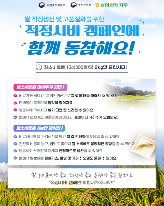 시 관계자는 “고품질 쌀 생산을 위해 질소질 비료를 2kg만 줄여도 쌀 과잉생산을 막아 쌀값 안정화에 도움이 되며, 밥맛도 좋아져 쌀 소비에 긍정적인 영향을 줄 수 있다”고 말했다. 또한, “7월 잦은 비 소식이 예정되어 있어 병해충 발생이 우려되므로 관내 벼 재배 농가들이 질소질 비료 적정・적량 시비에 적극적으로 참여해달라????고 당부했다.