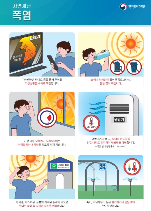 일상생활에서도 ▲술이나 카페인 음료보다는 물을 자주 마시기 ▲오후 2시 부터 오후 5시에는 되도록 야외활동하지 않기 ▲외출 시 양산이나 모자 등으로 햇볕 차단하기 ▲시원한 환경을 유지하기 ▲헐렁하고 가벼운 밝은색의 의복 착용하기 등 주의가 필요하다.