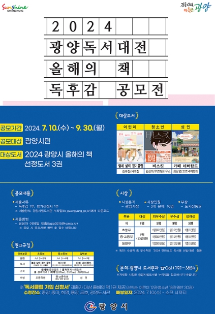 ![]() 광양시, 2024 ‘올해의 책’ 독후감 공모전 개최 |