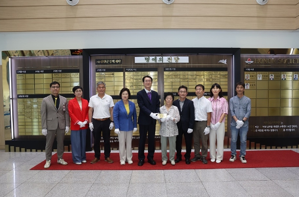 ![]() 신안군청 명예의 전당에서 故 김정철·박사예 부부 현판을 게시하며 기념 촬영을 하고 있다. |