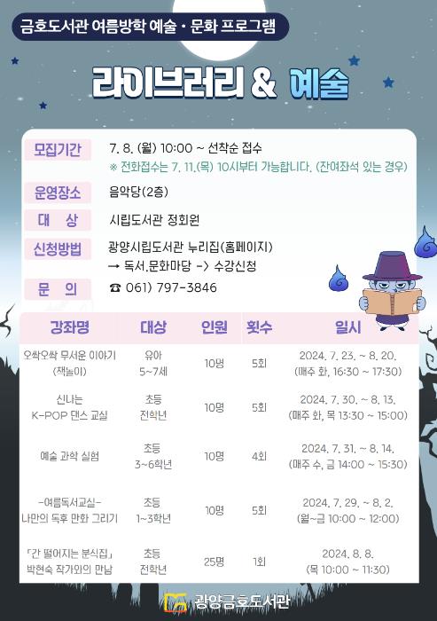 ![]() 광양금호도서관, 여름방학 예술ㆍ문화 프로그램 수강생 모집 |