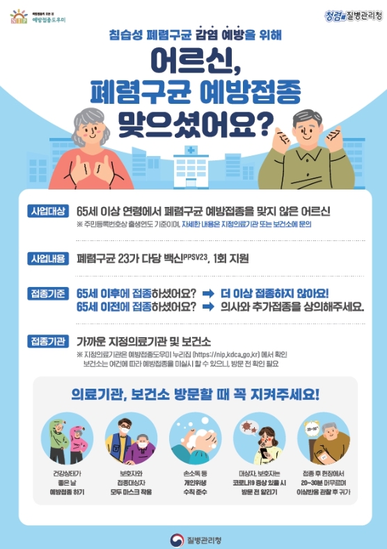보건소 관계자는 ‘폐렴구균 감염증 예방을 위해 올해 첫 무료 접종자인 1959년생 어르신과 아직 접종하지 않은 어르신은 빠른 시일 내 접종할 수 있도록 당부드린다.’고 전했다.