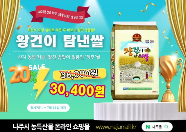 나주시는 ‘왕건이 탐낸 쌀’이 지난해에 이어 올해까지 2년 연속 전남 10대 브랜드 쌀에 선정되면서 특판행사를 마련했다. 7월 한 달간 정상가 대비 20% 할인된 가격에 무료 배송 서비스도 받아볼 수 있다.