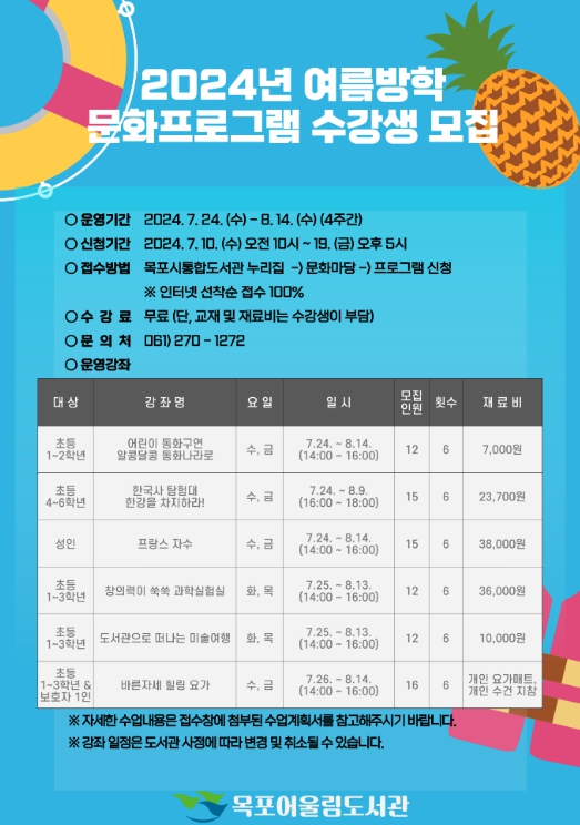 이번 여름방학 문화프로그램은 학생들을 위한 어린이 동화구연, 한국사 탐험대, 창의력이 쑥쑥 과학실험실, 도서관으로 떠나는 미술여행과 성인을 위한 프랑스 자수 수업 그리고 자녀와 부모가 함께 할 수 있는 바른자세 힐링 요가 수업까지 다채로운 주제로 구성되어 있다.