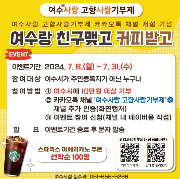 ![]() 여수시, 고향사랑기부제 참여 이벤트 “여수랑 친구맺고 커피받고” |