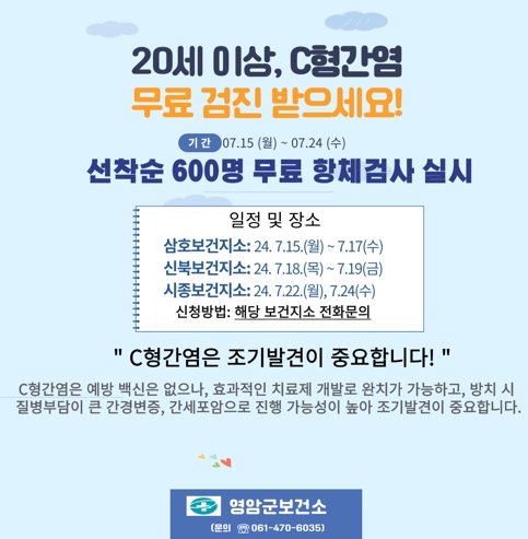 ![]() 영암군보건소, C형간염 무료 항체검사 받으세요 |