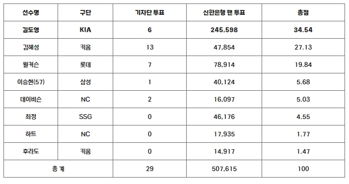 김도영은 기자단 투표 30표 중 6표(20.7%), 팬 투표에서 507,615표 중 245,598표(48.4%)를 받아 총점 34.54점을 획득, 기자단 13표, 팬 투표 47,854표, 총점 27.13점으로 2위를 차지한 키움 김혜성을 제치고 최종 1위에 올랐다. 김도영은 지난 3~4월 월간 MVP로 선정된 이후 전반기에만 두 번째 수상하는 영광을 안았다.