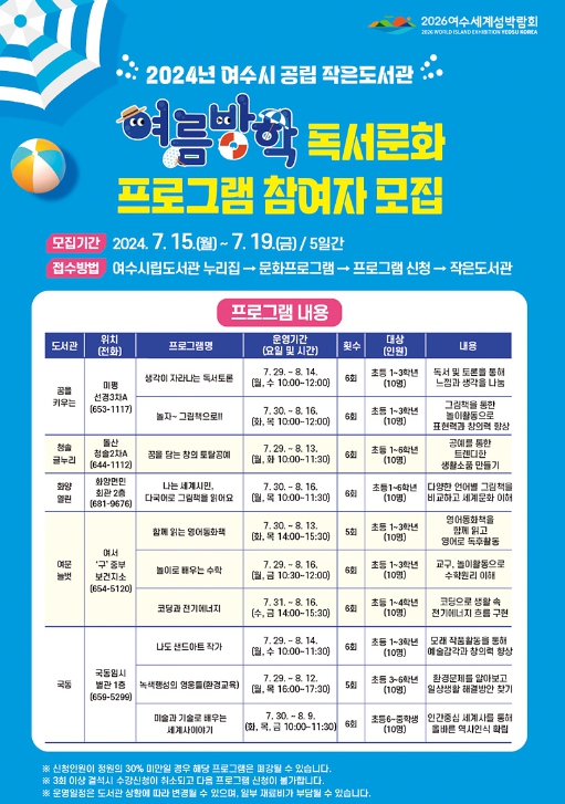 ![]() 여수시 공립 작은도서관, ‘여름방학 독서문화 프로그램’ 참여자 모집 |