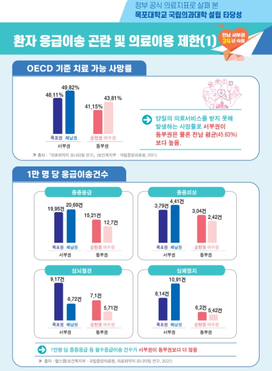 시는 의료취약지 모니터링 연구(보건복지부, 국립중앙의료원 2021), 헬스맵(보건복지부·국립중앙의료원, 의료취약지 모니터링 연구), 국가통계포털(국민건강보험공단-2022년 지역별 의료이용 통계) 등의 정부 공식자료 분석 결과를 토대로 전남 서부권은 양질의 의료서비스를 받지 못해 발생하는 OECD 기준 치료 가능 사망률이 약 50%에 육박해 순천권 41.15% 및 여수권 43.81%, 전남 평균인 45.63%보다 더 높다고 말했다.