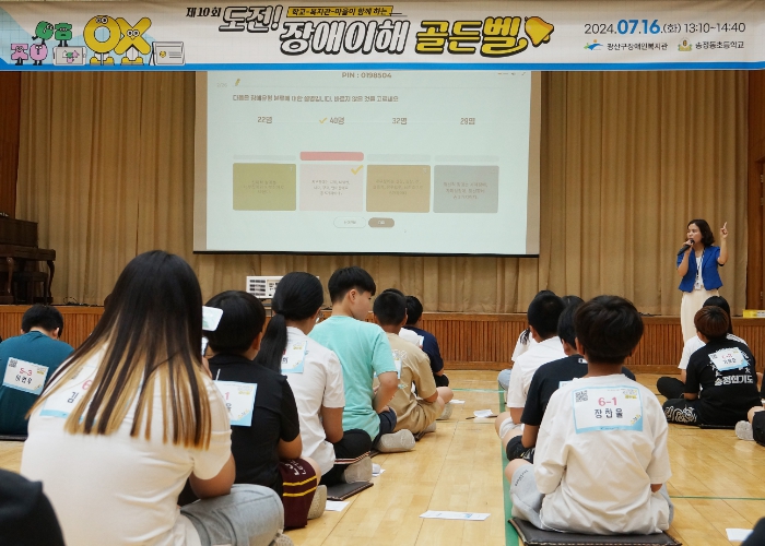 송정동초등학교 5, 6학년 학생 130여 명이 참여한 이날 행사는 온라인 퀴즈 플랫폼을 활용해 진행됐다.