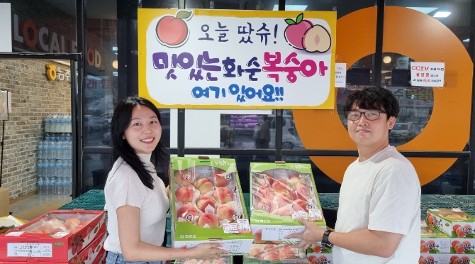 ![]() 복숭아 : 농업기술센터 직원들이 능주농협 로컬푸드에서 판매 중인 경봉 상품 세트를 들고 있는 장면 |