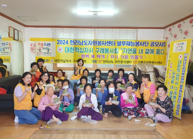 대한적십자사 구례봉사회는 ‘자연을 내 곁에 품다’를 주제로 편백 목베개 만들기와 미니 가든 만들기 체험 활동을 경로당 어르신들에게 제공했다.