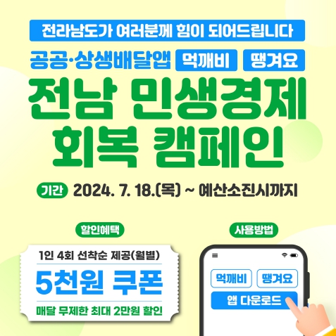 이번 할인캠페인은 전라남도에서 운영하고 있는 배달앱인 공공배달앱 ‘먹깨비’와 상생배달앱 ‘땡겨요’에서 매월 1인 4회, 5천원 할인쿠폰을 지급하여 소비자는 최대 2만원의 할인 혜택을 누릴 수 있다.