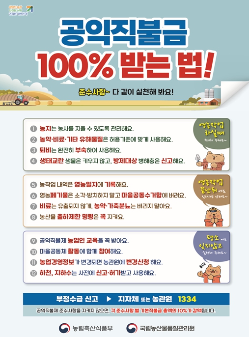 2020년에 도입된 공익직불제는 농업․농촌의 공익적 기능을 증진하면서 농업에 종사하는 농업인의 소득안정을 돕기 위해 직불금을 지원하는 제도다. 직불금을 100% 받기 위해서는 농가가 법령에서 정한 17가지 의무 준수사항을 모두 실천해야 한다.