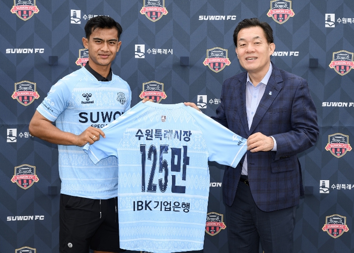 ![]() 아르한 선수가 이재준 수원시장에게 써드 유니폼을 전달하고 있다. |