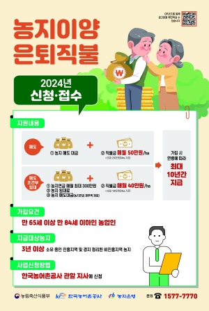 한국농어촌공사는 “농지이양은퇴직불사업” 및 “농지연금”을 통하여 고령농업인의 노후를 직접 지원함으로써 고령화로 인해 소멸위기의 농촌에 청년농업인의 유입을 기대하고 있으며 농업인의 삶의 질 향상에 최선을 다하겠다” 고 밝혔다.