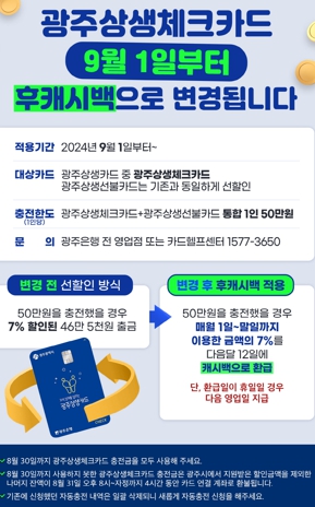 ![]() 광주광역시상생체크카드, 9월부터 캐시백으로 변경 |
