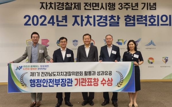 행안부는 전국 18개 자치경찰위원회를 대상으로 분야별 성과를 평가한 결과 전남도자치경찰위원회는 5개 우수기관 중 하나로 선정돼 서울, 부산과 함께 협력회의에서 성과발표도 하는 영예를 안았다. 기관표창 시상은 행안부 주관으로 18일 열린 자치경찰협력회의에서 이뤄졌다.