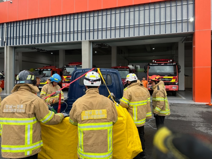 ![]() 장흥소방서, 이동식 소화수조 사용한 전기차 화재진압훈련 나서 |