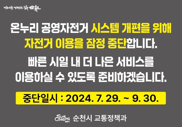 다만, 차세대 시스템 구축 기간 내 자전거 이용 시민들의 안전을 위해 오는 7월 29일부터 약 2개월간 한시적으로 ‘온누리’ 공영자전거 서비스 이용이 중단된다.