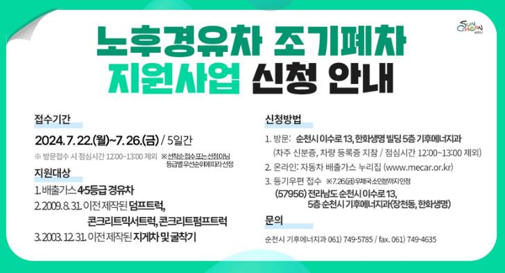 ![]() 순천시, 2024년 노후경유차 조기폐차 지원사업 추가 접수 |