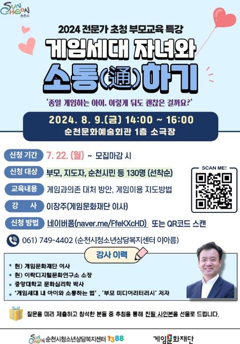 ![]() 순천시, 2024 전문가 초청 부모특강 '게임세대 자녀와 소통하기' 개최 |