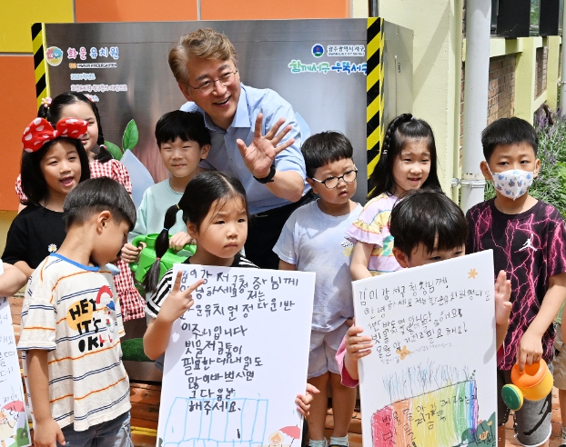 화운유치원 아이들의 간절한 바람이 이뤄졌다. 광주광역시 서구(구청장 김이강)는 지난 5월 화운유치원에서 보내온 편지 내용을 사업에 반영해 최근 유치원 내 빗물저금통 설치를 완료했다.