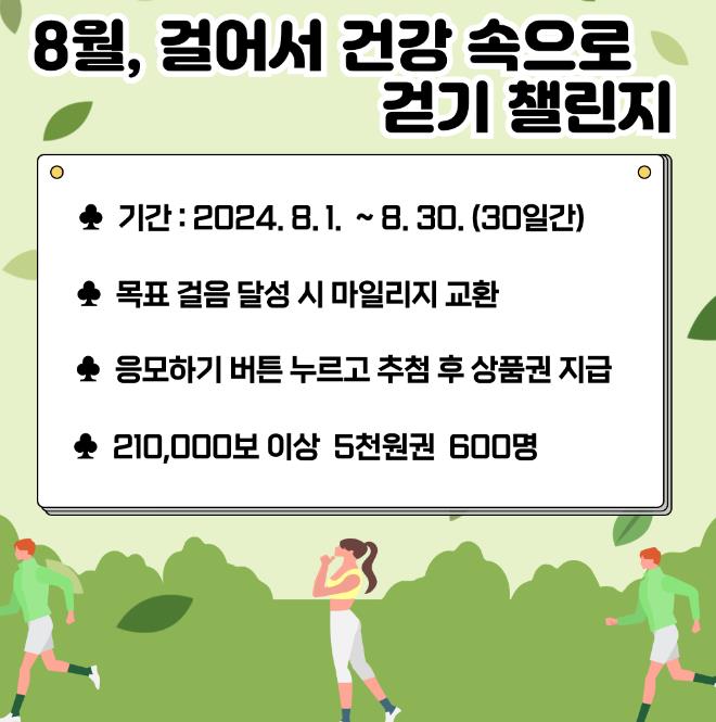 기간은 8월 1일부터 8월 30일까지로 1걸음에 1마일리지가 적립된다.