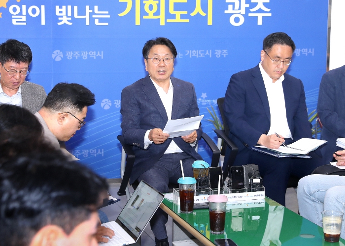 ![]() 강기정 광주광역시장이 23일 오전 시청 5층 기자실에서 출입기자들과 차담회를 갖고 시정 주요현안 등에 대해 설명하고 있다. / 광주광역시 제공 |