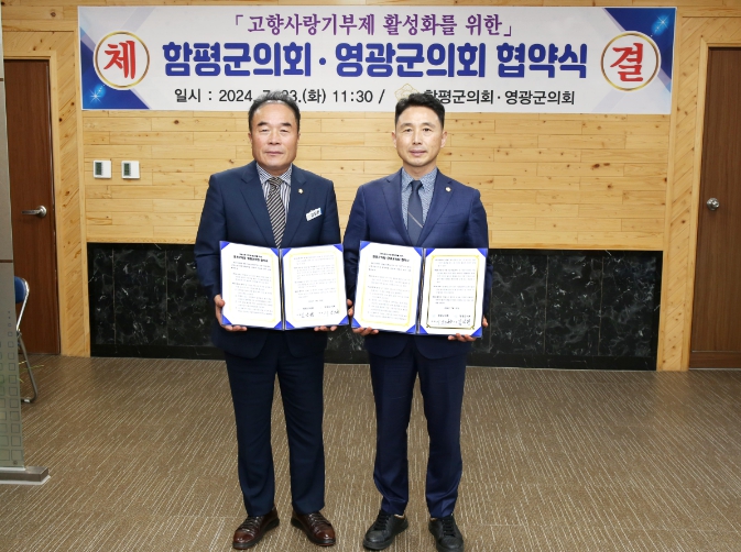 영광군의회와 함평군의회는 지난 2023년 상호 간 고향사랑기부제 정착을 위해 업무 협약을 체결한 바 있으며, 올해는 고향사랑기부제 협력체계를 유지하고 고향사랑기부제 활성화 방안을 마련하기 위해 협약을 체결했다.