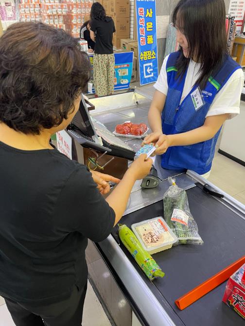 ![]() 농식품바우처 IC카드를 활용해 식료품을 구입하고 있는 모습 |