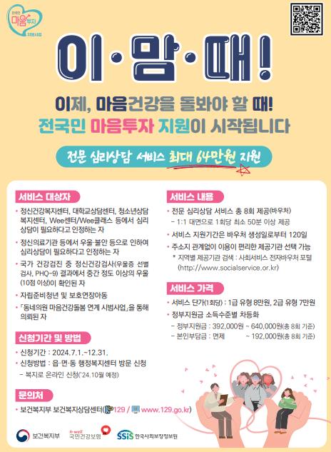 전국민 마음투자 지원사업(‘이제, 마음건강, 돌봐야 할 때’)은 지난해 정부가 발표한 ‘정신건강정책 혁신방안’에 따라 국민의 마음건강 돌봄 및 정신질환 사전 예방과 조기 발견을 위해 추진하고 있다.