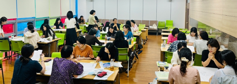 ![]() 중등 독서인문교육 역량강화 연수에 참여한 교사들이 함께 독서토론 수업안을 협의하고 있다. |