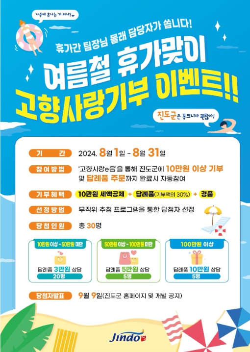 무더운 여름철에도 진도군을 향해 기부해 주시는 기부자들에게 진도군의 특별한 특산품 꾸러미를 8월 한 달간 지급해 드리는 경품 이벤트이다.