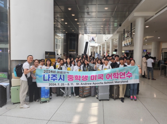 29일 나주시에 따르면 중학교 2학년 학생 30명이 지난달 25일부터 미국 메릴랜드주 세인트 앤드류 어포슬 스쿨에서 현지 학생들과 합동 수업, 홈스테이, 명문대학 및 명소 탐방 등 어학연수 중이다.