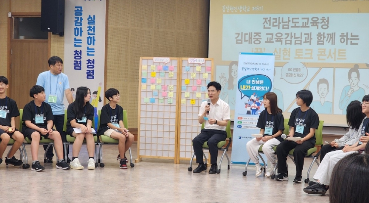 ![]() 3기 꿈실현 인생학교에 참가한 학생들이 김대중 전남교육감과 대화하고 있다. |