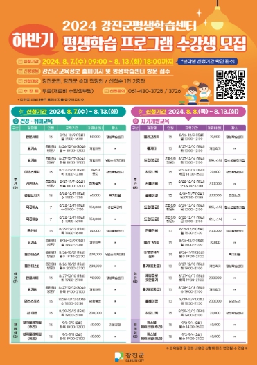 모집은 8월 7일부터 13일까지 선착순이며, 건강·취미교육(18강좌)는 7일부터 접수를 받고, 자기개발교육(18강좌)는 8일부터 모집한다. 강진군 교육정보 홈페이지 또는 강진군 평생학습센터를 직접 방문해 신청하면 된다. 강의는 8월 26일부터 순차적으로 개강해 12월 말까지 진행된다.