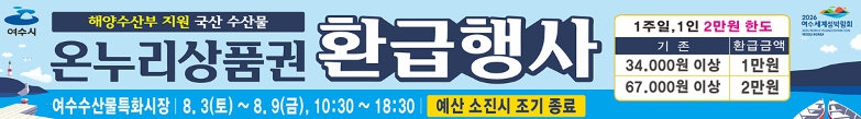![]() 여수시(시장 정기명)가 8월 3일부터 9일까지 여수수산물특화시장 수산물 구매 금액 최대 30%를 온누리상품권으로 환급한다고 밝혔다. |