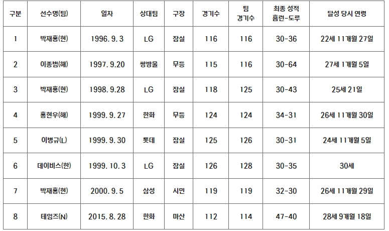 특히 30일(화) 기준 20세 9개월 28일의 나이인 김도영이 이번 시즌 30-30을 달성할 시, 종전 최연소 기록이었던 박재홍(전 현대)의 22세 11개월 27일을 약 2년 앞당기며 최연소 기록을 세우게 된다.