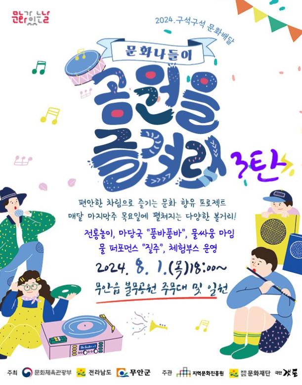 ‘공연을 즐겨라’는 문화체육관광부의 ‘2024 문화가 있는 날 구석구석 문화배달’ 공모사업에 선정되어 진행하는 행사로 문화체육관광부, 전라남도, 무안군이 주최하고 지역문화진흥원, 전남문화재단, 극단갯돌이 주관한다.