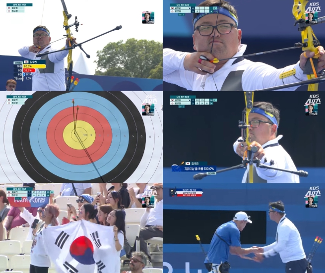 김우진은 30일(이하 한국시각) 2024 파리올림픽 양궁 남자 개인전 32강전에서 10점 행진을 벌이며 린쯔썅(대만)을 6대0으로 꺾고 16강에 진출했다. 전날 후배들 응원에 다 쉬어버린 목소리로 안타까움을 자아냈던 기보배 위원은 한결 나아진 컨디션으로 “어제 너무 죄송했다”며 중계에 임했다.