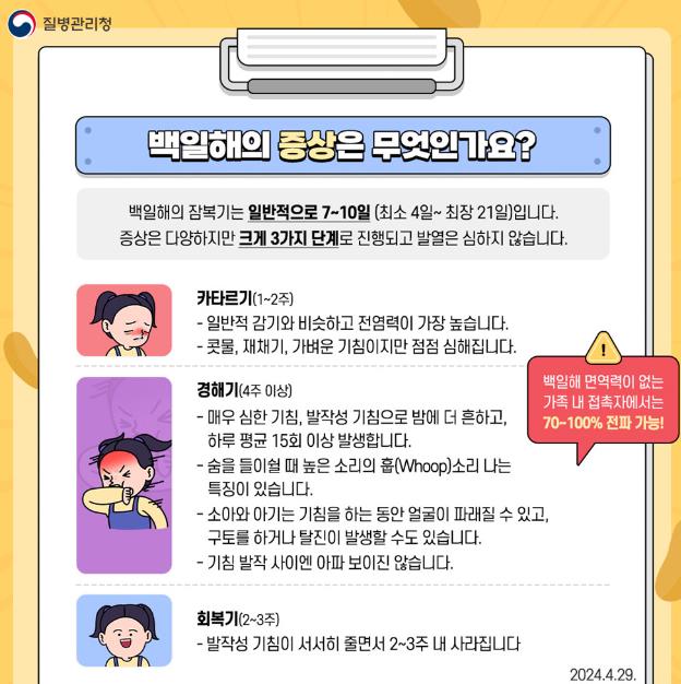 백일해는 백일해균 감염에 의한 급성 호흡기 질환으로 경한 기침, 발작성 기침, 콧물 등의 증상을 보인다.