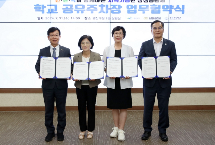 광주 광산구(구청장 박병규)는 31일 구청 2층 상황실에서 송정초등학교(교장 강성순), 수문초등학교(교장 박민숙)와 ‘학교 공유주차장 업무협약’을 체결했다.