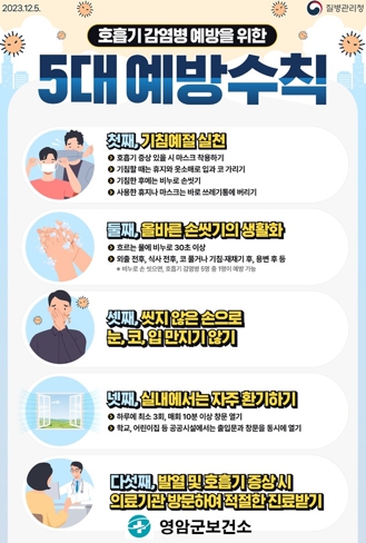 특히, 기침 예절 준수, 올바른 손씻기 시행 등 ‘호흡기 감염병 5대 예방수칙’ 실천의 중요성을 알리고, 그 방법을 영암군홈페이지, 영암e랑, 공식 SNS 등에 홍보하고 나섰다.