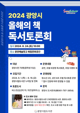 참가 신청 대상은 책에 관심 있는 중학생 이상의 지역 주민이며 신청 기간은 8월 1일부터다. 토론에 참여를 원하는 사람은 광양시립도서관 누리집에 접속하거나 도서관지원팀으로 전화해 신청할 수 있다.